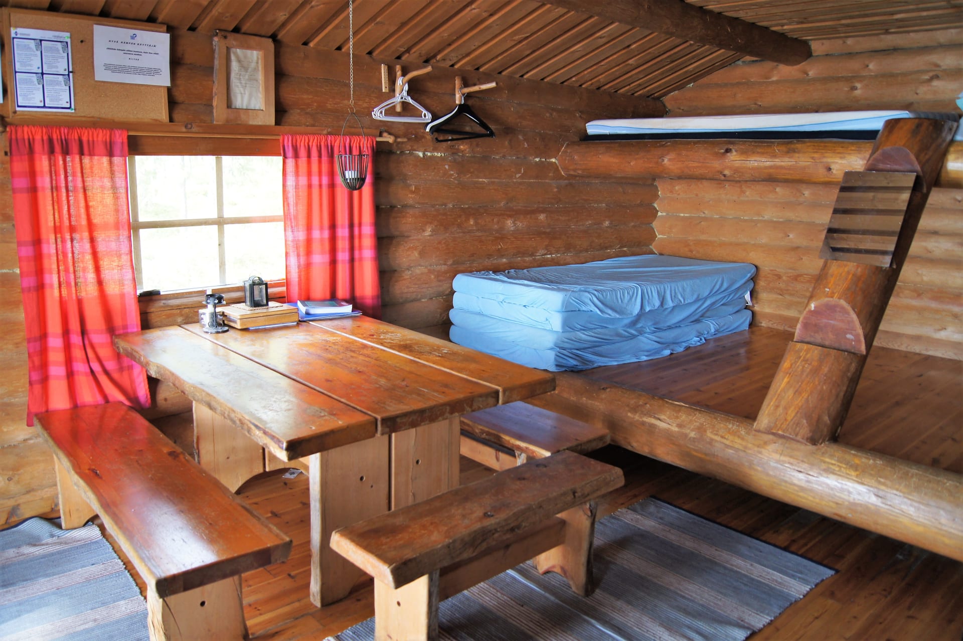 Ahveninen has one room with a large common bed as a sleeping area. The cottage is heated with a wood-burning stove. There is no tap water in the cottage. Domestic water is carried from the pond and drinking water is brought by yourself.