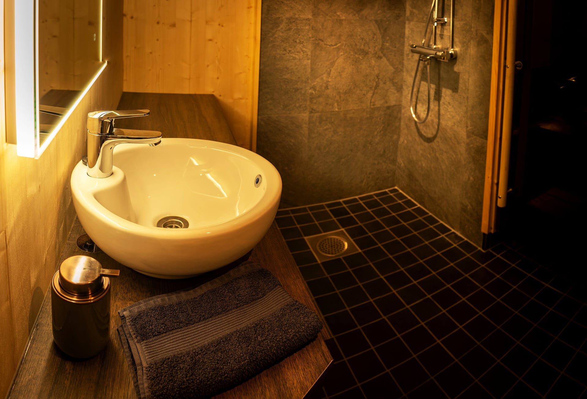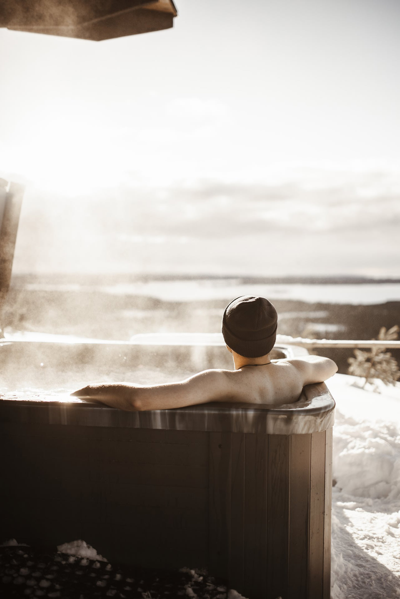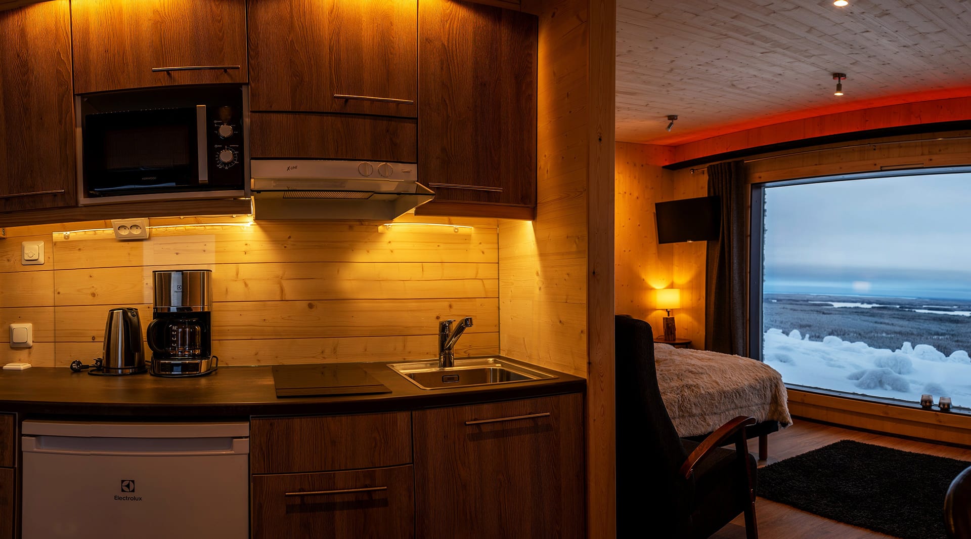 The cabin’s large landscape window welcomes you to be part of the wild nature 24 hours a day. Enjoy and make yourself comfortable in the motorized bed surrounded by peaceful nature. Pause for moment in relaxing landscape sauna after an outdoors. The highlight of your stay is the outdoor jacuzzi on the terrace with its magnificent views: glowing sunsets and wildly dancing Northern Lights await you there! Make memories that will last a lifetime.