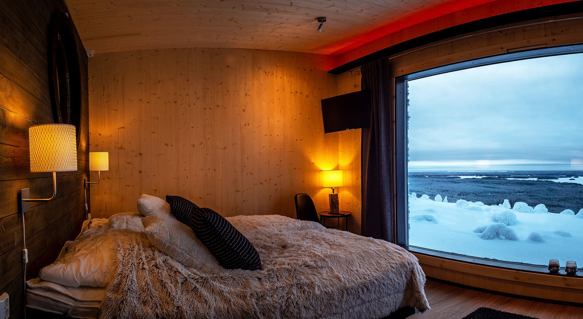 The cabin’s large landscape window welcomes you to be part of the wild nature 24 hours a day. Enjoy and make yourself comfortable in the motorized bed surrounded by peaceful nature. Pause for moment in relaxing landscape sauna after an outdoors. The highlight of your stay is the outdoor jacuzzi on the terrace with its magnificent views: glowing sunsets and wildly dancing Northern Lights await you there! Make memories that will last a lifetime.