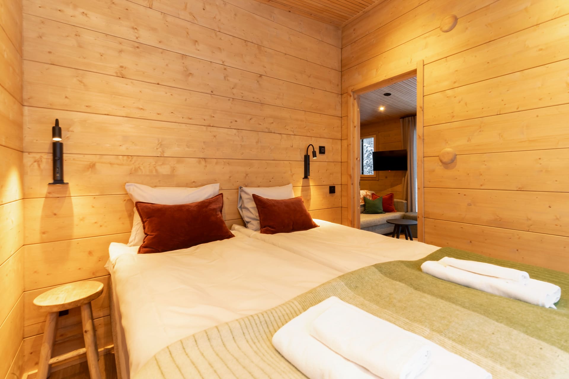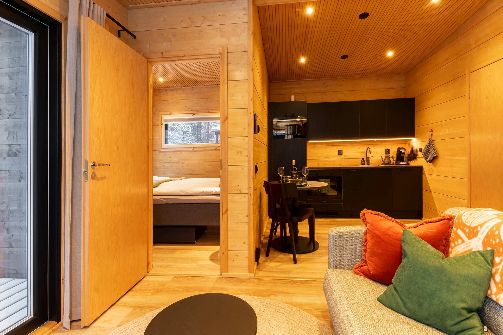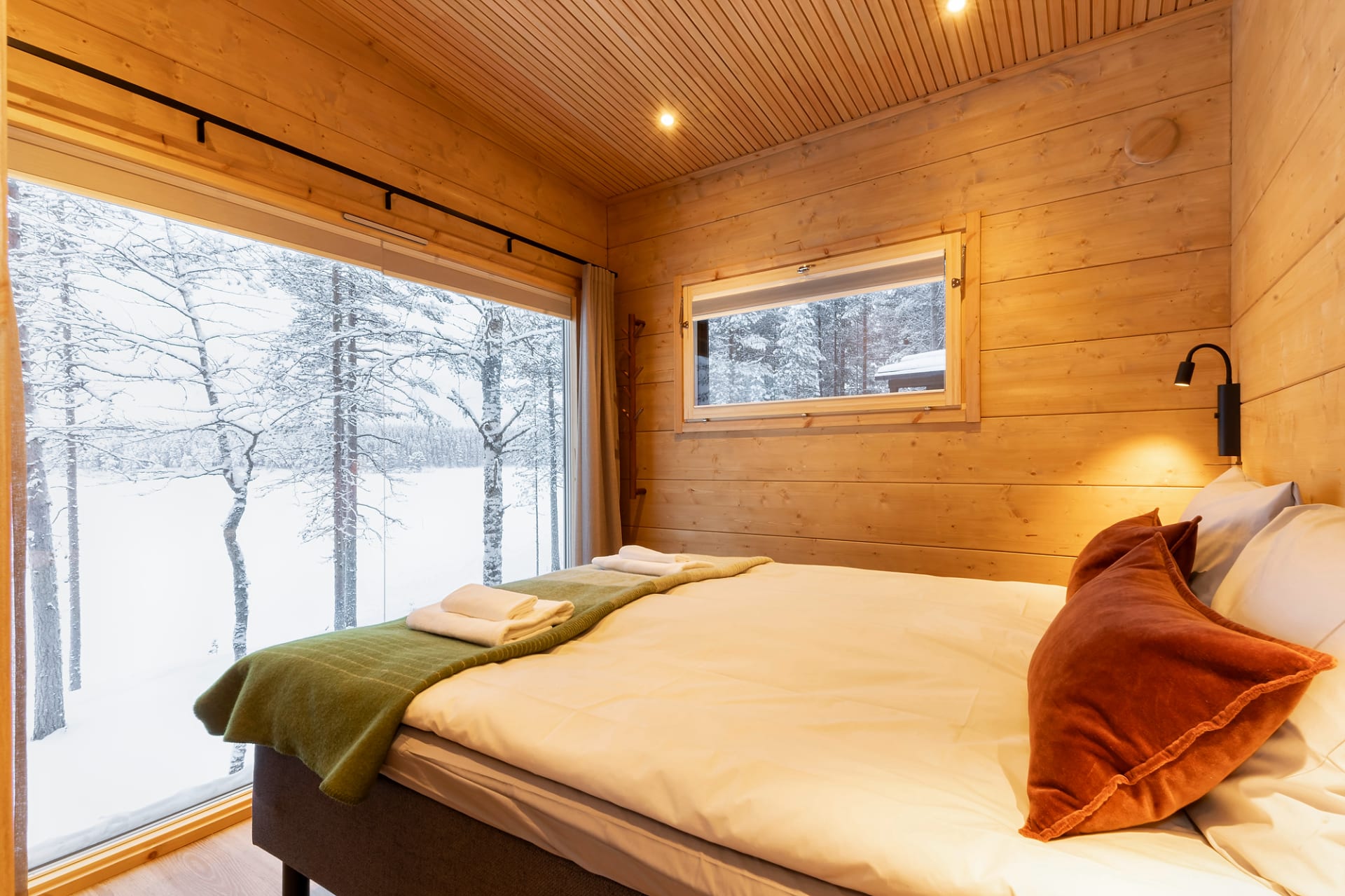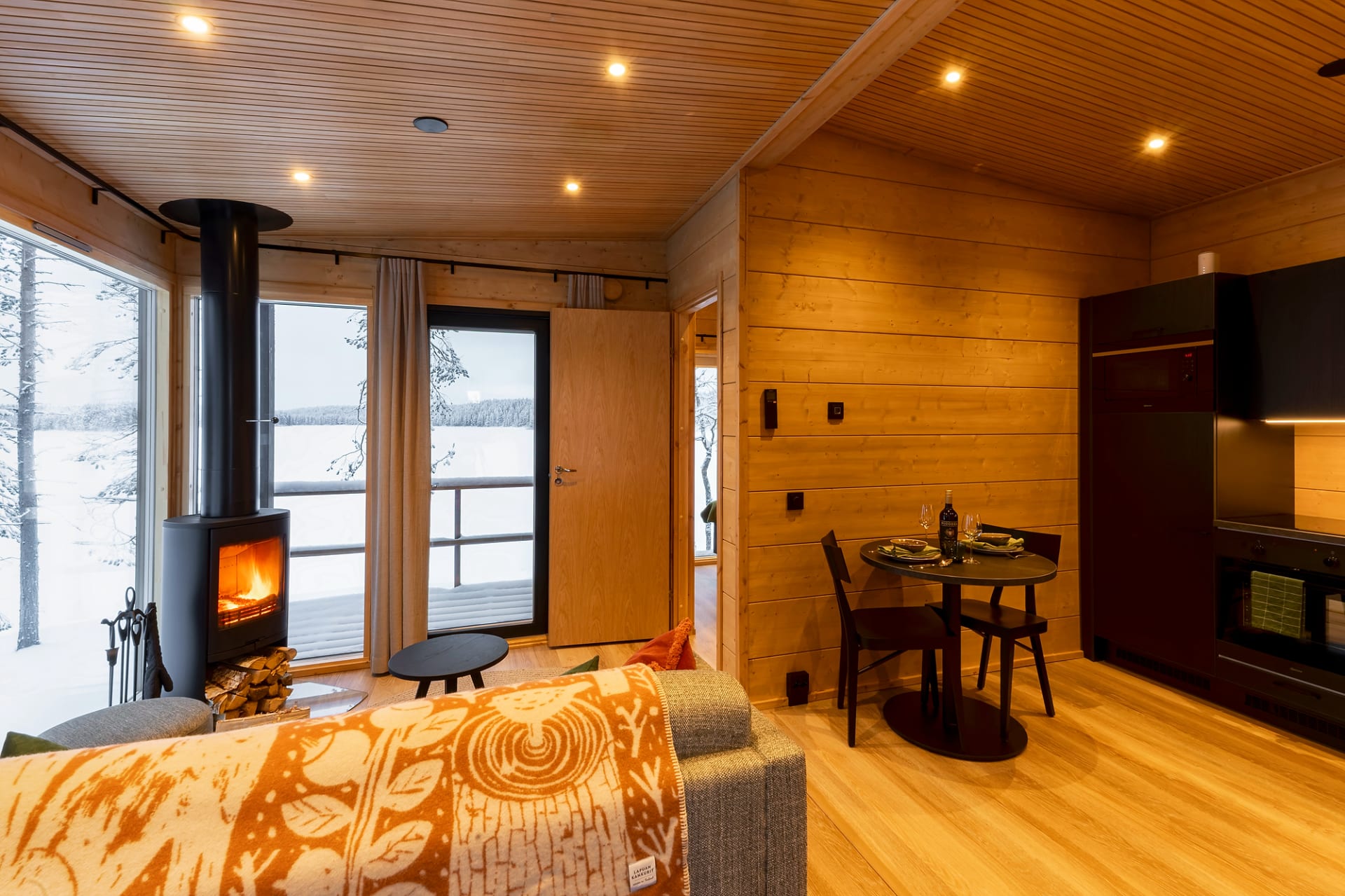 This chalet is the perfect place to unwind and enjoy the peace of nature. Floor-to-ceiling windows and a lake-facing terrace bring the beauty of the surroundings right into the cabin. Glowing sunsets in summer and northern lights in winter create unforgettable moments.