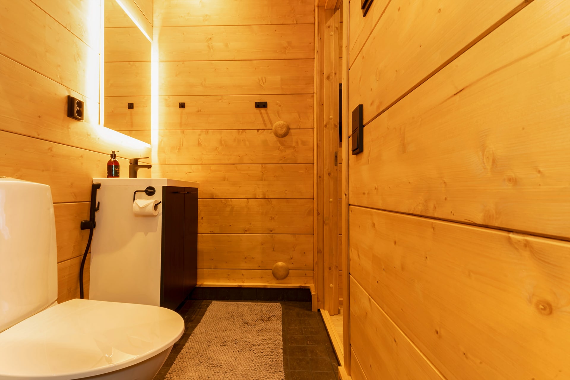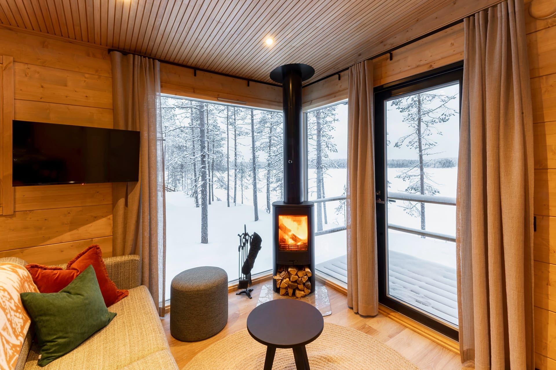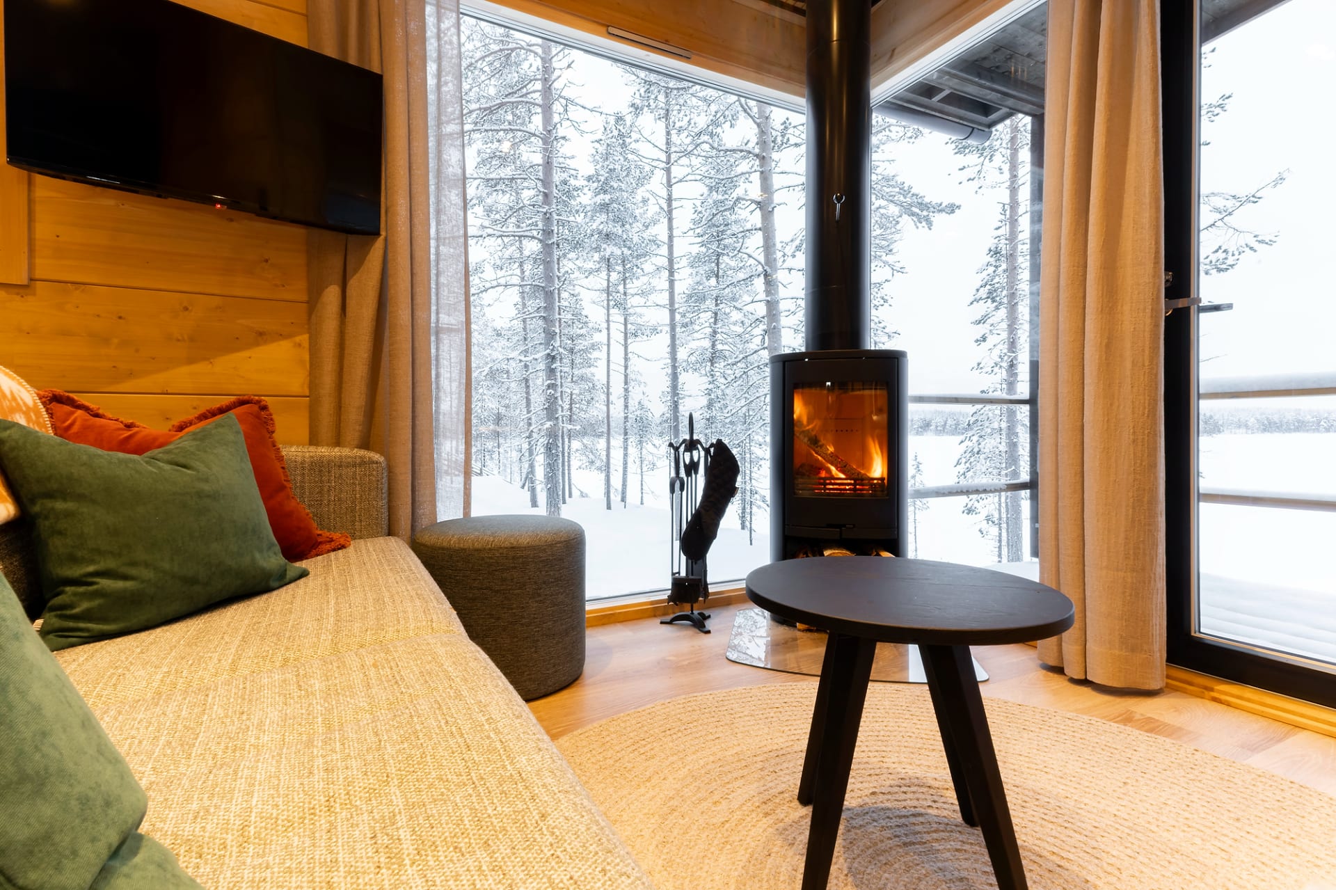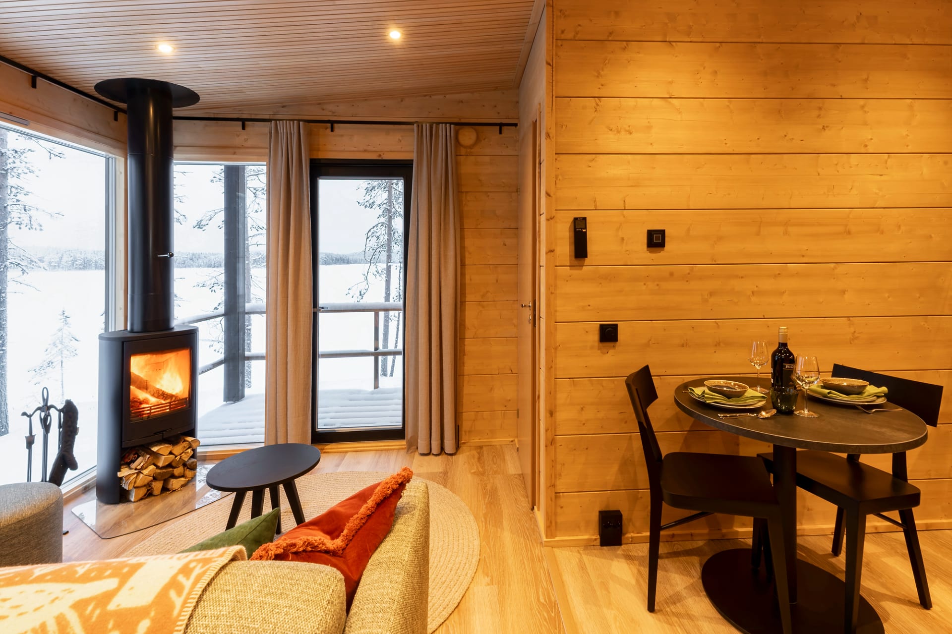 This chalet is the perfect place to unwind and enjoy the peace of nature. Floor-to-ceiling windows and a lake-facing terrace bring the beauty of the surroundings right into the cabin. Glowing sunsets in summer and northern lights in winter create unforgettable moments.