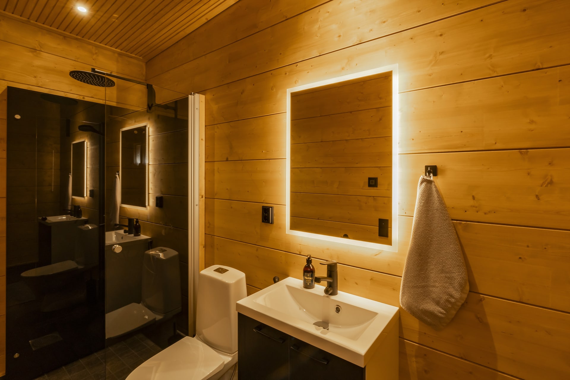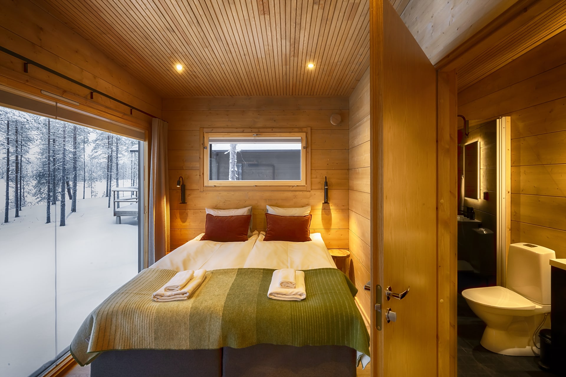 This 50 m² log chalet features two en-suite bedrooms, providing privacy and convenience for everyone. The cabin comfortably accommodates four guests, with a sofa bed for two additional visitors.