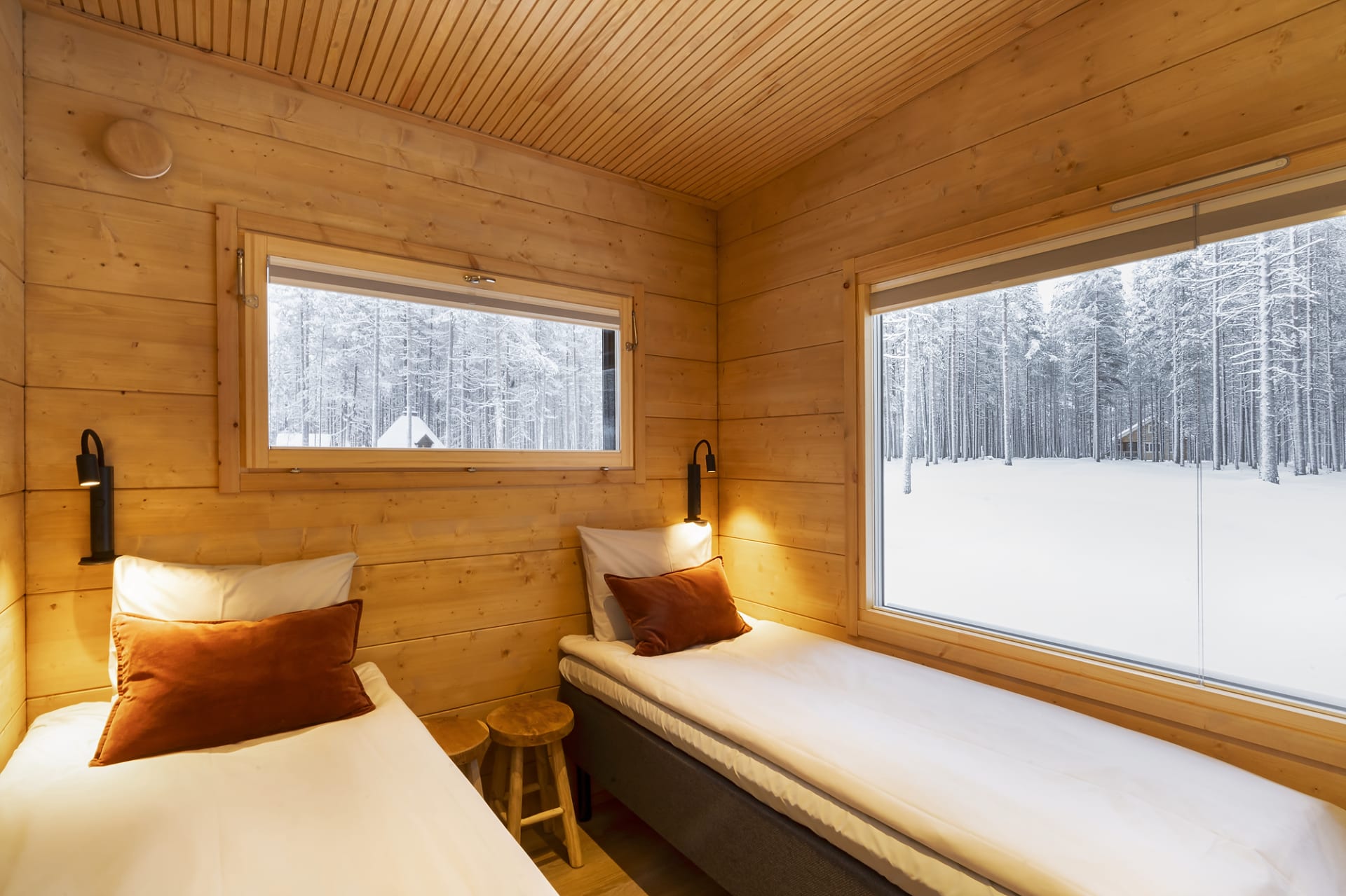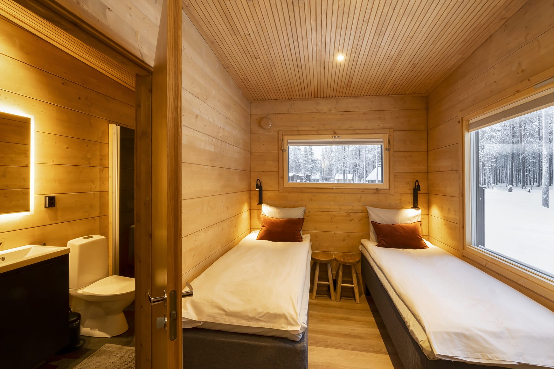 This 50 m² log chalet features two en-suite bedrooms, providing privacy and convenience for everyone. The cabin comfortably accommodates four guests, with a sofa bed for two additional visitors.